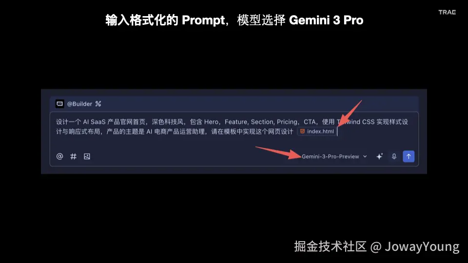 在 Trae 中输入格式化的 Prompt,模型选择Gemini-3-Pro-Preview以获得最佳效果。