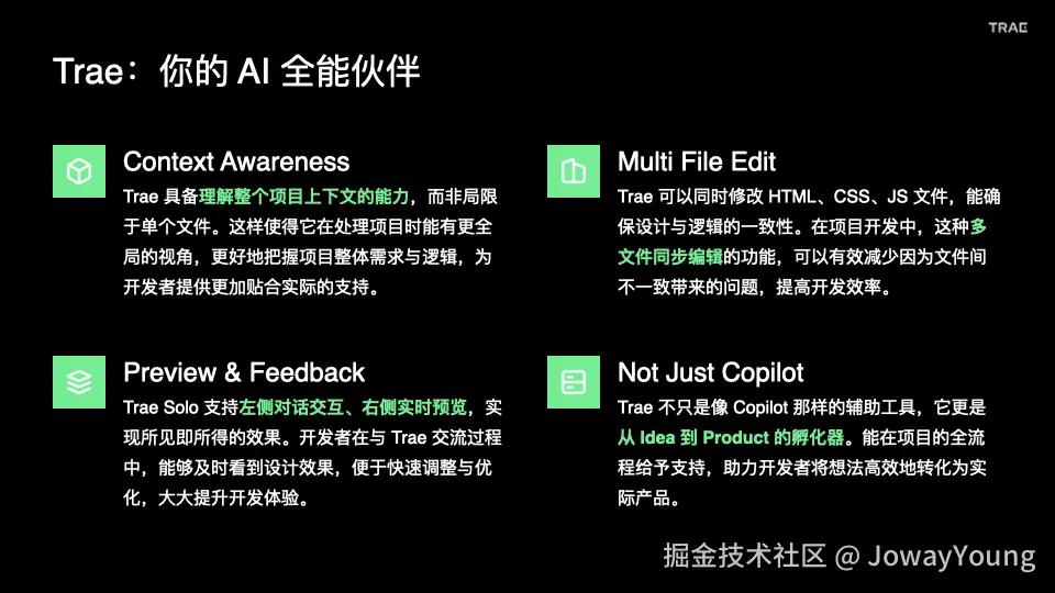 - Trae 的价值:补齐短板,让一个人成为一支队伍
