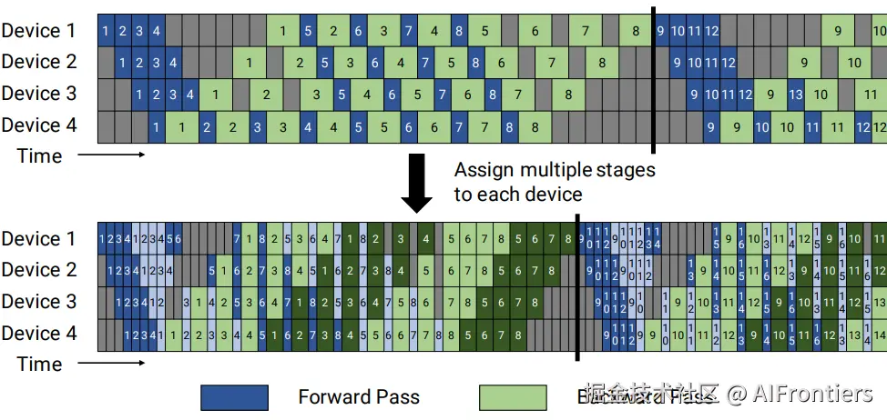 - 流水线 并行 的1F1B调度:为了解决跨层并行的负载均衡问题,Megatron-LM引入了1F1B(One-Forward-One-Backward)调度算法。通过将全局批次切分为多个微批次(Micro-batches),1F1B允许不同的流水线阶段在同一时间点并行处理不同的微批次,极大地压缩了流水线气泡(Pipeline Bubble)占用的时间比例,从而提升了集群的整体利用率。