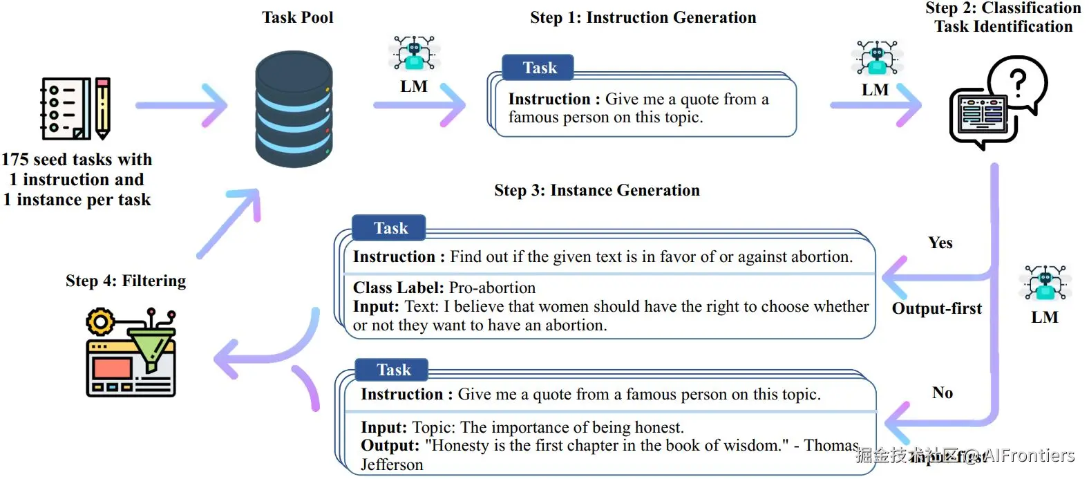 其底层逻辑是一种迭代的自引导算法。该过程始于一个包含175个由人类编写的种子任务的微型集合。每个任务由一条指令和相应的<输入, 输出>示例组成。框架通过利用LLM的上下文学习能力,从任务池中随机抽取少量示例作为提示词,引导模型生成新的指令、输入以及对应的输出。