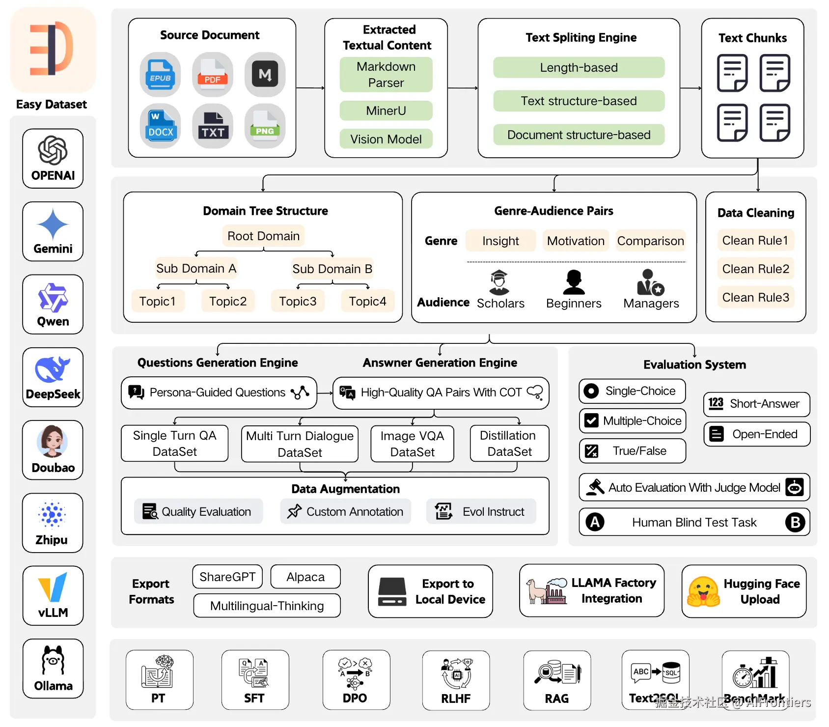 与探索算法边界的Self-Instruct、WizardLM不同,Easy Dataset框架聚焦垂直领域模型训练的工程痛点。金融、医疗、法律等行业的高质量指令数据多隐藏在各类非结构化文档中,难以高效利用,而这款集成化GUI 数据工程套件,实现了从文档解析到模型评估的全链路闭环。