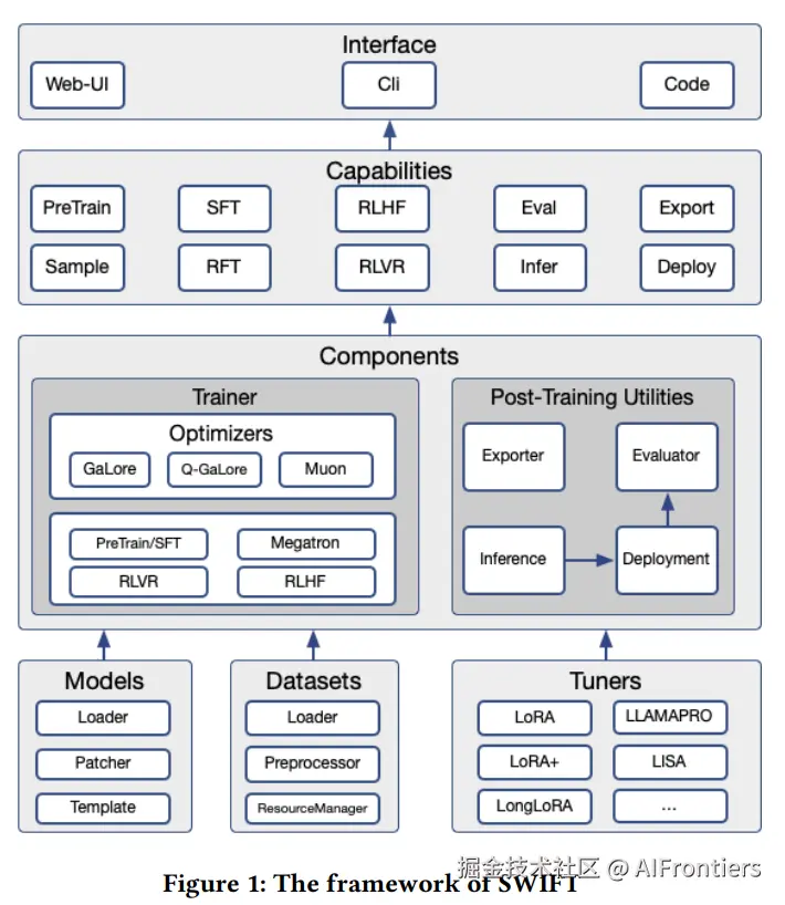 ms-swift(Scalable lightWeight Infrastructure for Fine-Tuning)阿里是ModelScope社区推出的全能型大模型微调框架,区别于LlamaFactory的易用性和Unsloth的性能追求,其以工业级的深度与广度为设计目标。该框架深度融合ModelScope生态,支持600余种纯文本模型、300余种多模态模型,覆盖图像、视频、音频等全模态输入。