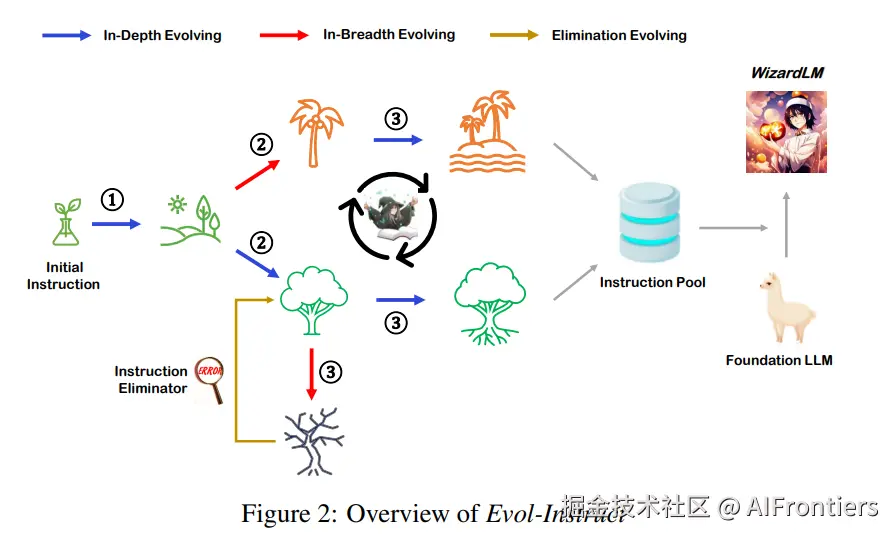 - 无信息增量: 进化的指令与原指令内容基本一致,没有实质性的复杂度提升,通常利用GPT-4进行自动判定。