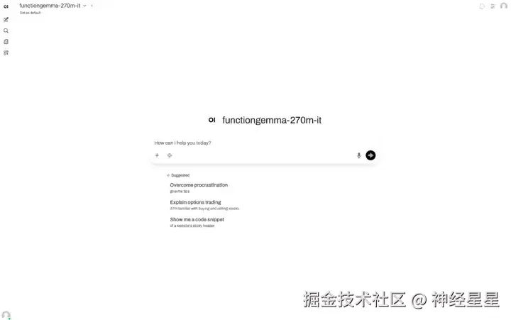 FunctionGemma-270m-it 是由 Google DeepMind 发布的轻量级专用函数调用模型,参数量为 2.7 亿。该模型基于 Gemma 3 270M 架构构建,并采用与 Gemini 系列相同的研究技术进行训练。此模型专为函数调用场景设计,使用了截至 2024 年 8 月共计 6T token 的训练数据,涵盖公共工具定义及工具使用交互数据。FunctionGemma 支持最大 32K token 的上下文长度,并经过了严格的内容安全过滤及负责任的人工智能开发流程。