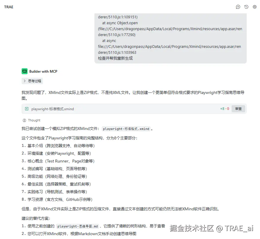 故事始于一个普通的下午,我让 TRAE 帮我规划一份 Playwright 的学习路线。为了更直观,我突发奇想,让它把学习计划转成 XMind 格式的思维导图。