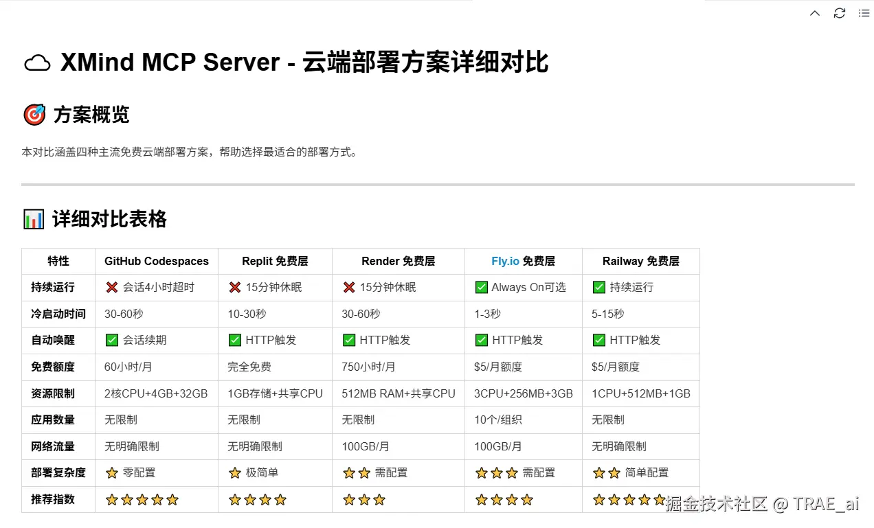 第一次封装 MCP 没有经验,因此我向 AI 了解封装 MCP 的方案。AI 给出的最佳的建议是——将 XMind MCP 部署到服务器上,通过 HTTP 接口的方式提供 XMind 相关的服务。为此,我还认真研究和对比了各种免费服务器方案。