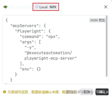 我故技重施,在 TRAE 的 MCP 市场中查看热门 MCP 的安装方式并提供给 AI 用于参考。我发现大部分 MCP 是不需要服务器,支持本地安装的。例如我最近正在学习的 playwright。