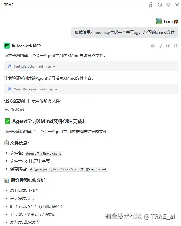 例如,你可以说: “帮我使用 XMind mcp 生成一个关于 agent 学习的 XMind 文件。”