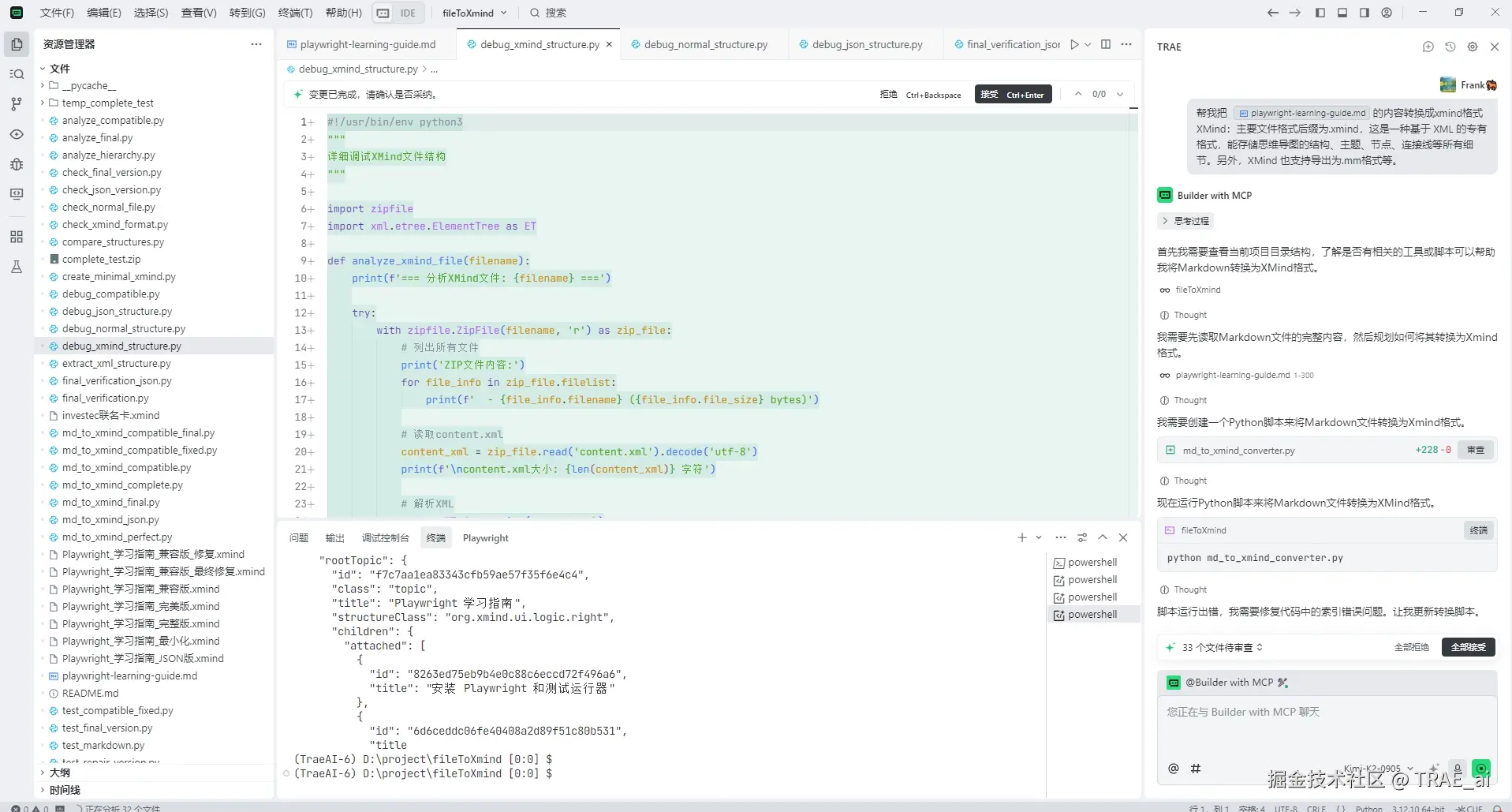 我打开 XMind,手动创建了一个简单的 XMind 文件,把它放在项目目录中作为“模板”交给 AI,让它参考这个文件的内部结构和 XML 格式来重新编写生成 XMind 的逻辑。这个方法立竿见影,仅用几轮对话,AI 就帮我写出了能生成可正常打开的 XMind 文件的核心代码!