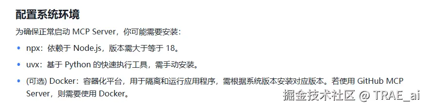 同时我查看了官方文档模型上下文协议(MCP) - 文档 - TRAE CN( docs.trae.cn/ide/model-c… ),支持本地打包安装的方式大抵有这三种