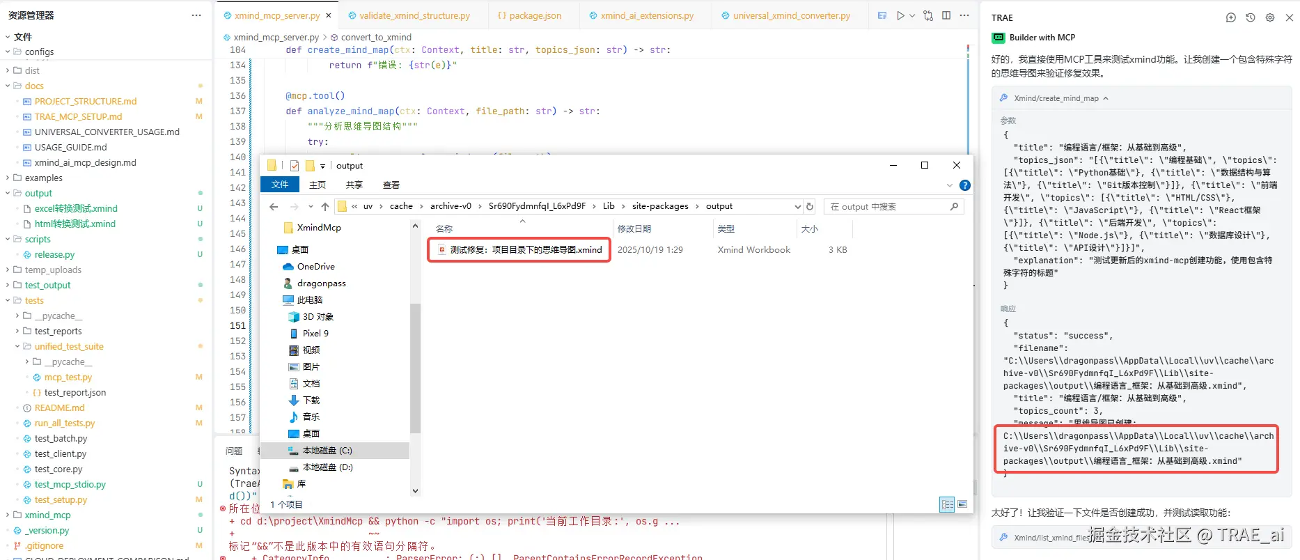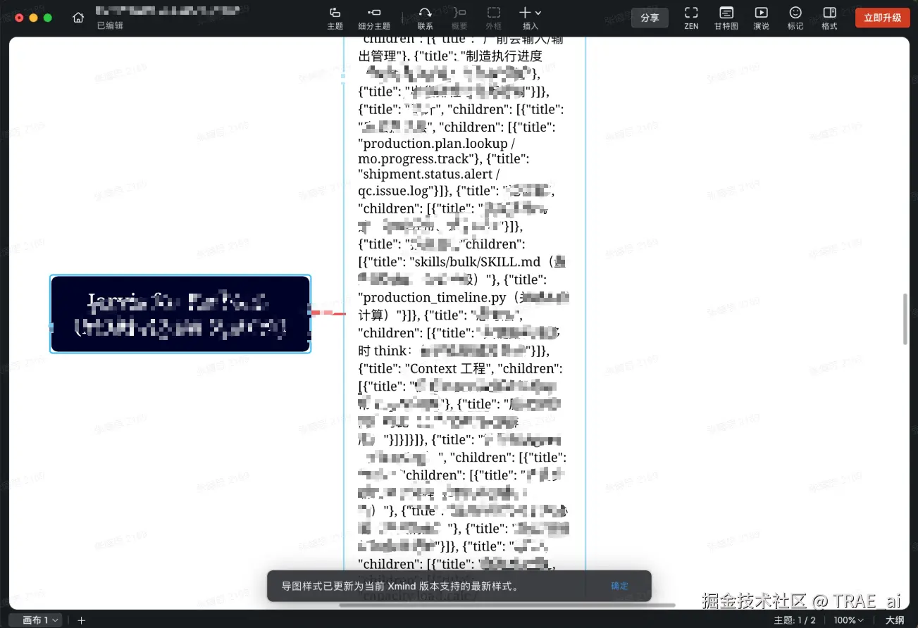 这次优化效果显著。经过 4 天、21 个版本的迭代,在 TRAE 的持续帮助下,这个 XMind MCP 工具终于达到了稳定好用的状态。现在,AI 已经能一次性生成结构清晰、内容正确的思维导图了。