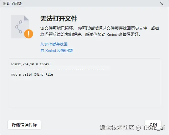 AI 很快给了我一个 XMind 文件,但当我尝试用 XMind 打开时,却收到了无情的错误提示。