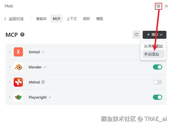 第一步:复制配置在 TRAE 对话框的“设置” -> “MCP”标签页下,点击“手动添加”,然后粘贴以下 JSON 配置: