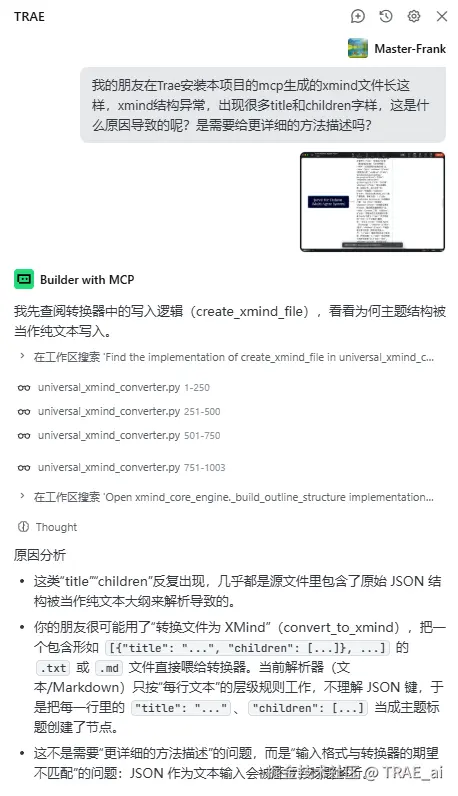 我在本地测试通过后,我邀请了社区的 Nolan 大佬帮忙测试。果然,“不出意外就要出意外了”。在他的项目里,AI 似乎没完全理解如何正确调用我的 XMind MCP,导致生成的 XMind 结构错乱。