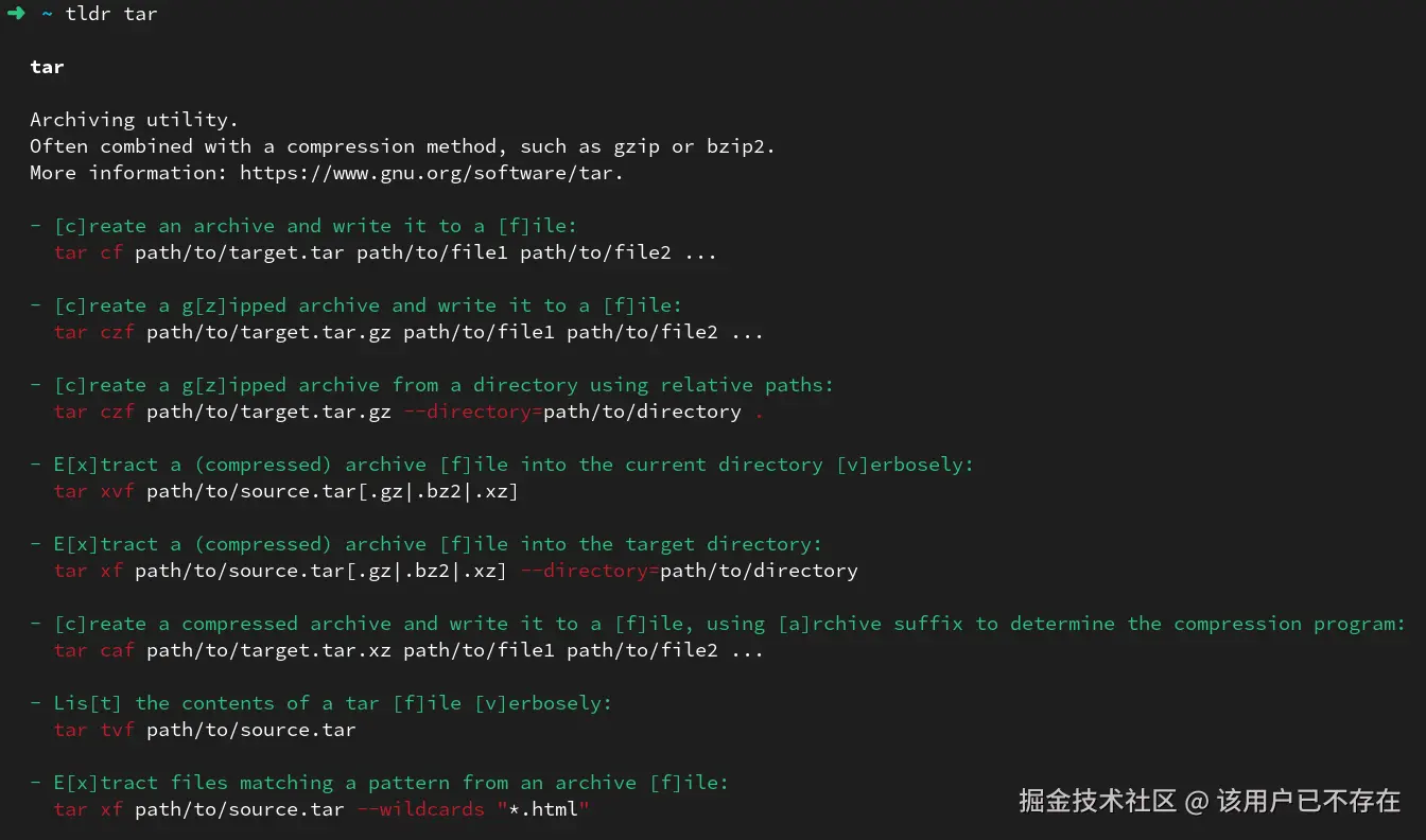 TLDR(Too Long; Didn't Read)Pages 解决了这个问题。它是由社区维护的简化版文档,只列出该命令最常用的 5-10 个实际使用案例。比如查询 tar,它会直接给出压缩和解压的常用命令组合,而不是列出几百个参数选项。它不是要替代官方文档,而是作为一种快速参考,在开发者卡壳的那一瞬间提供最直接的帮助,大幅节省查阅资料的时间。