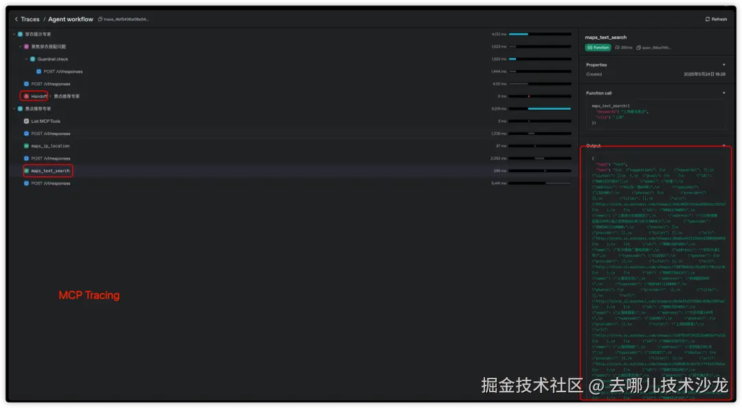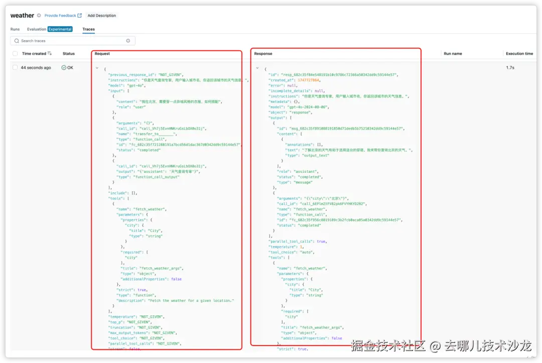 交互可以很好的看清楚对应token消耗,入参和系统提示词以及对应functioncall,两个agent交接展示也是functioncall,时速度很快,但是存在2点展示不太好: