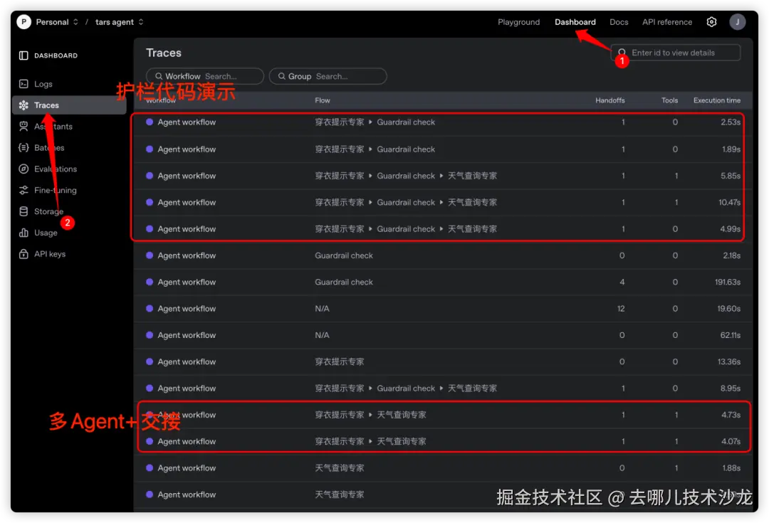 在Agent初期,对于几乎“黑盒”系统来说,我们的掌控感和信任感会特别的弱,而Tracing这个能力就给我们带来一束“曙光”。我们可以在开发阶段,测试阶段甚至是部分线上场景对Agent进行监控和可视化的追踪。可以帮助我们快速定位和解决问题;除此之外OpenAI 的SDK中还支持基于追踪数据,可以进一步微调或蒸馏模型,持续优化智能体在实际业务场景中的效率和效果,例如提高回复的准确性、减少错误操作。