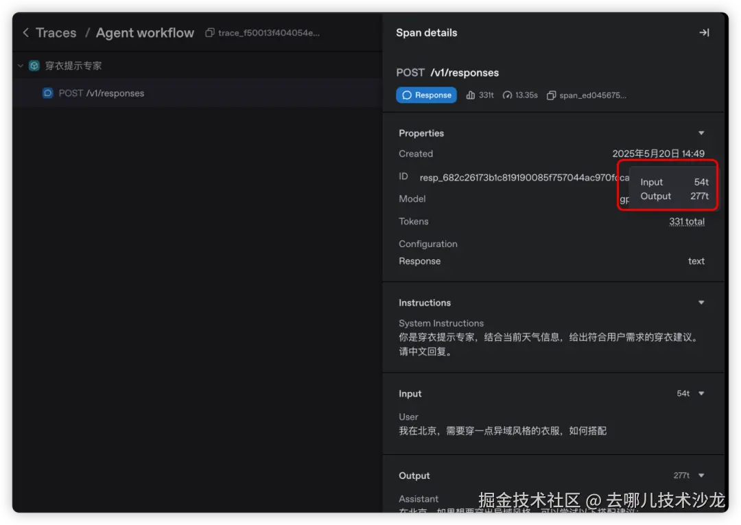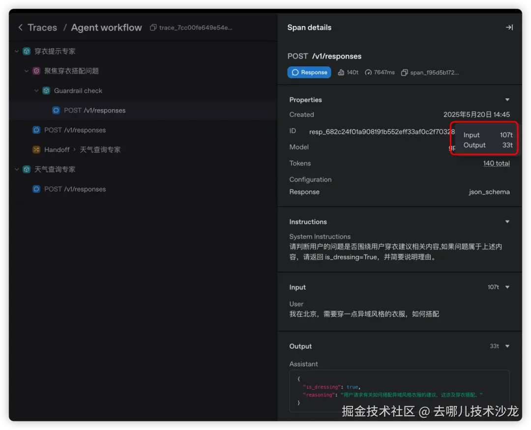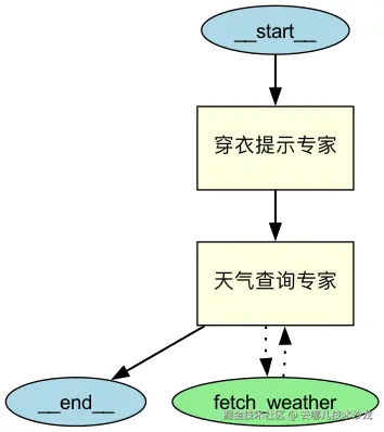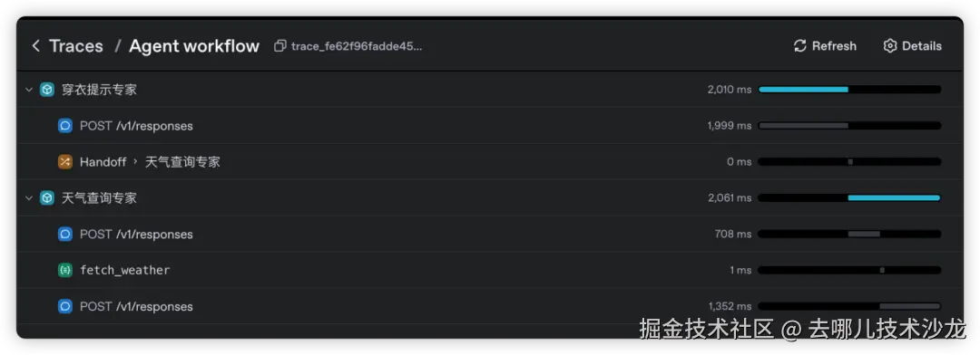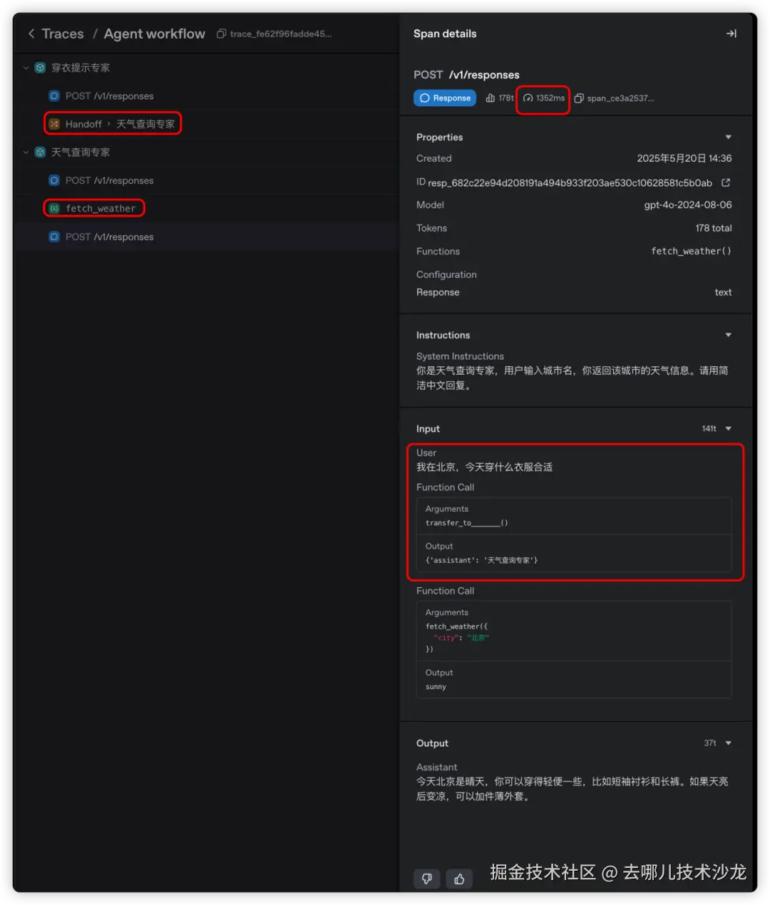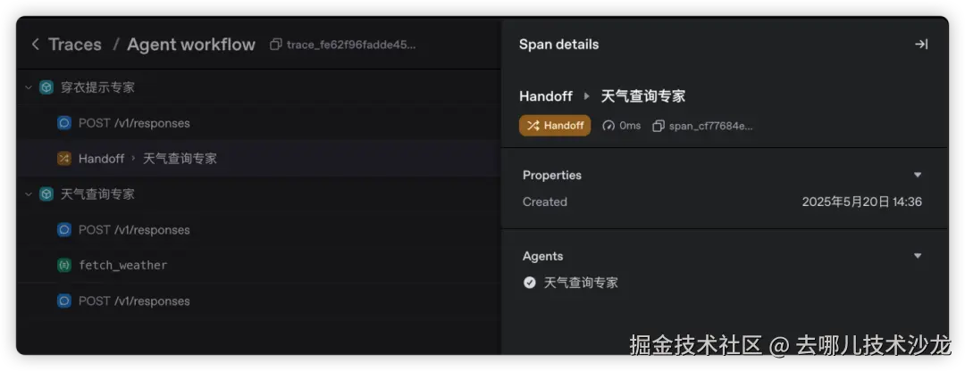 现在开始构建多个Agent用来观察后面的新特性,例如本段代码示例为一个“天气专家”再加上一个“穿衣专家”两个Agent,回答用户的关于穿衣服的一些回答。 两个agent之间“穿衣专家” 使用 “天气专家”给出的天气信息进行总结天气因素,也就是需要两个专家的“交接”,最终给出对应穿衣风格搭配建议。(后面的tracing模块会对交互细节进行阐述)