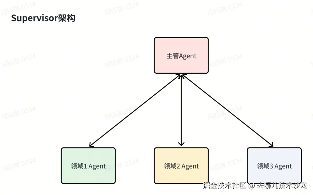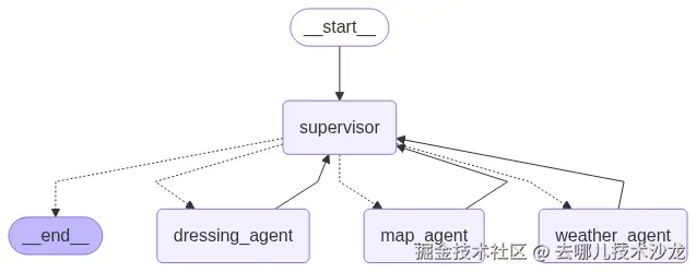 一是监管架构(Supervisor):各个代理由中央 Supervisor 代理协调。主管控制所有通信流和任务委派,根据当前上下文和任务要求决定调用哪个代理。