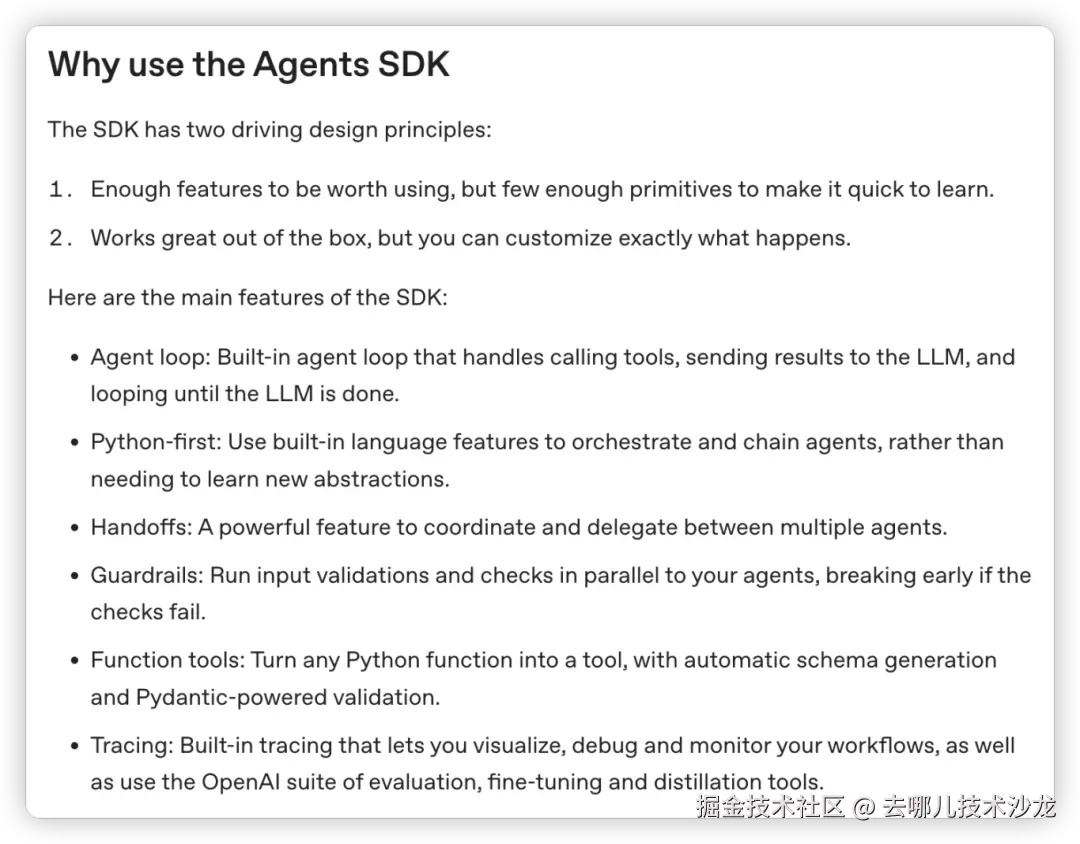 在官网上OpenAI给出了两个理由使用它,而且也介绍了 Agent Loop、Python-first、Handoffs、Guardrails 、Function tools 和 Tracing 6个特性,对于现阶段的我们对Python-first 和 Function tools 就不做过多的阐述了,但是其他的四个特性还需要进一步详细阐述。