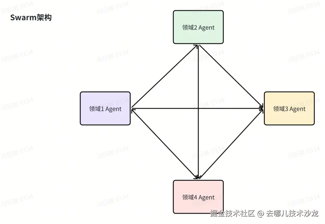 另外一个是集群架构(Swarm):各个Agent根据其专长动态地将控制权移交给彼此。系统会记住最后一个处于活动状态的座席,确保在后续交互中,与该座席的对话恢复。