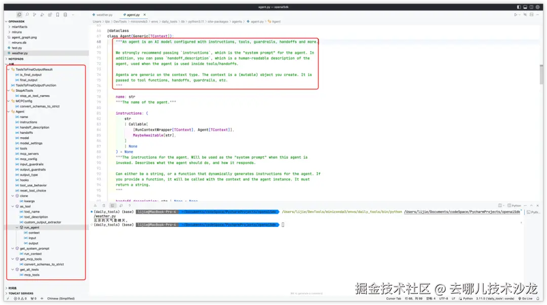 首先我们先写一个简单的示例,然后再开始一点点的把我们想要了解的特性走一遍。 我们先用python写一个简单的agent,可以查询天气: