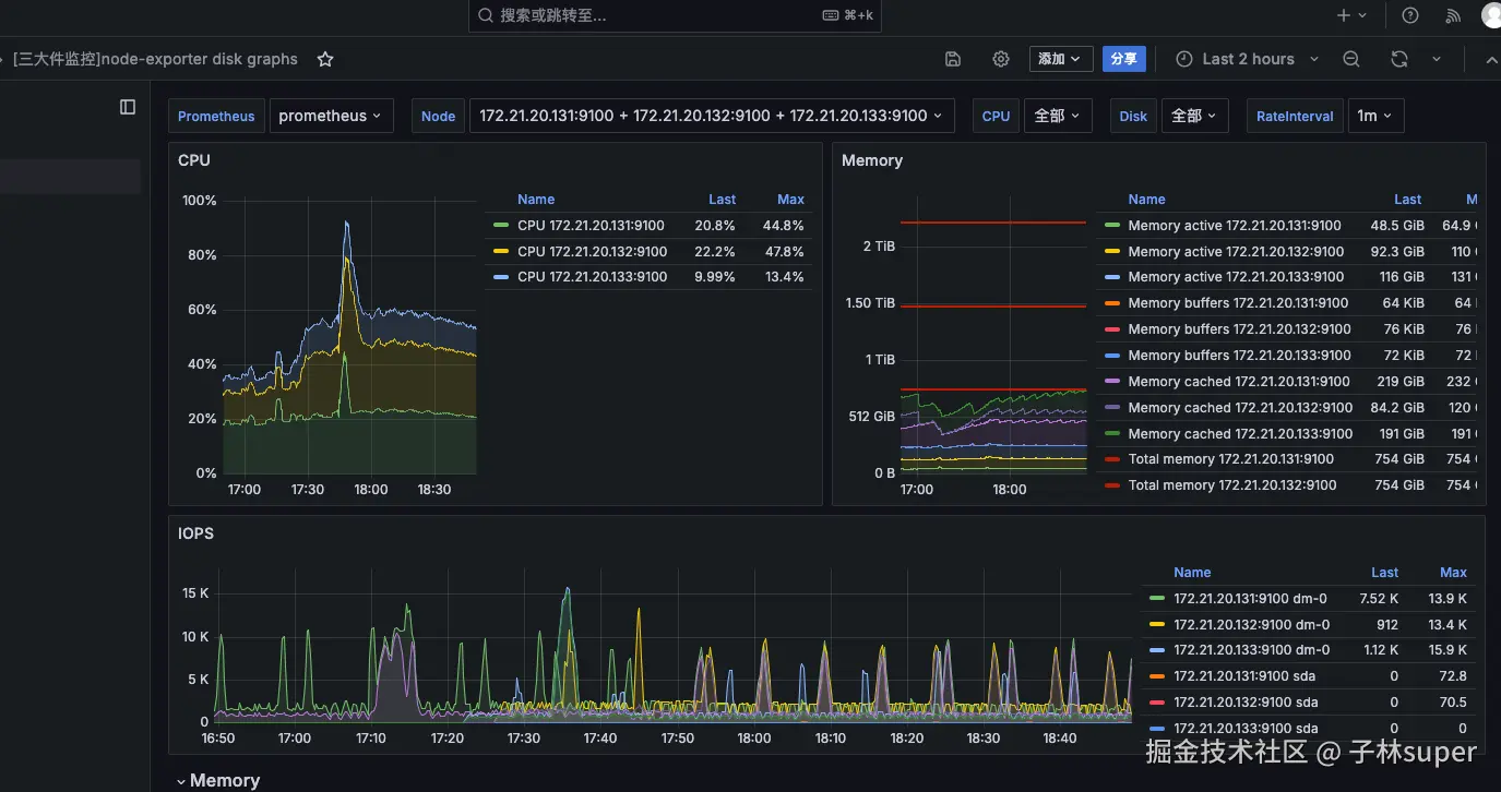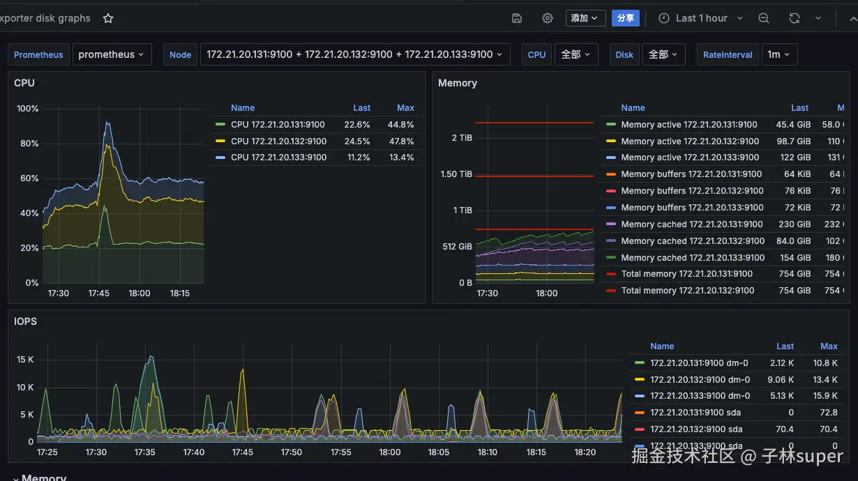 - 131、132和133主机上此时的CPU、内存、磁盘IO监控情况: