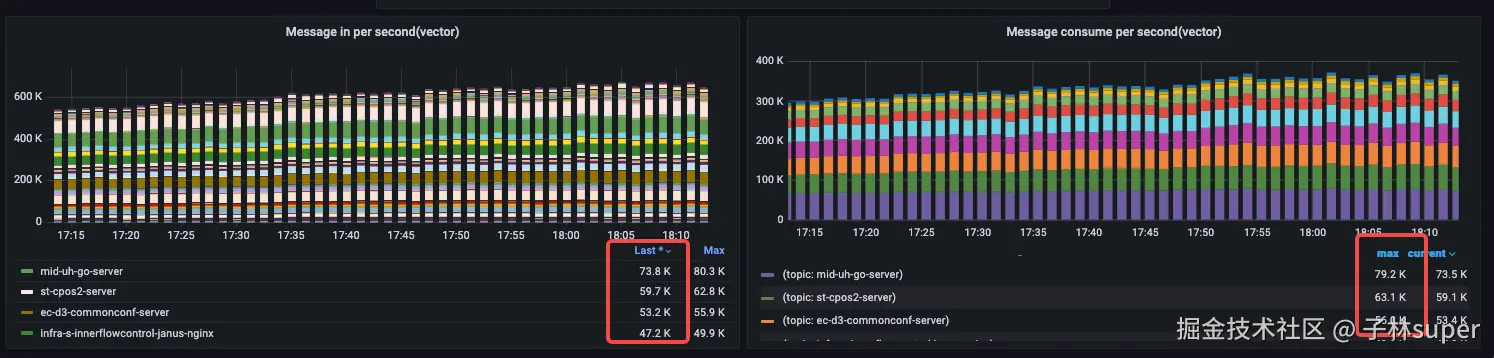 后来16:20左右 扩容的vector实例(4个),vlinsert进程扩容了一倍(总32个,每个节点8个) 。 vector消费能力提升了点,但仍然落后kafka的生产速率。