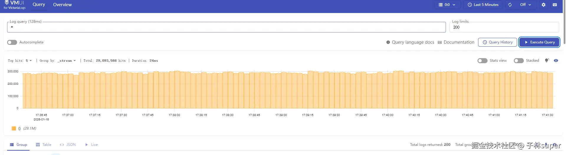 5min 写入23,351,550条 Vector 的平均 吞吐量 约为 77,839 条/秒。cpumax为20c mem max为11g