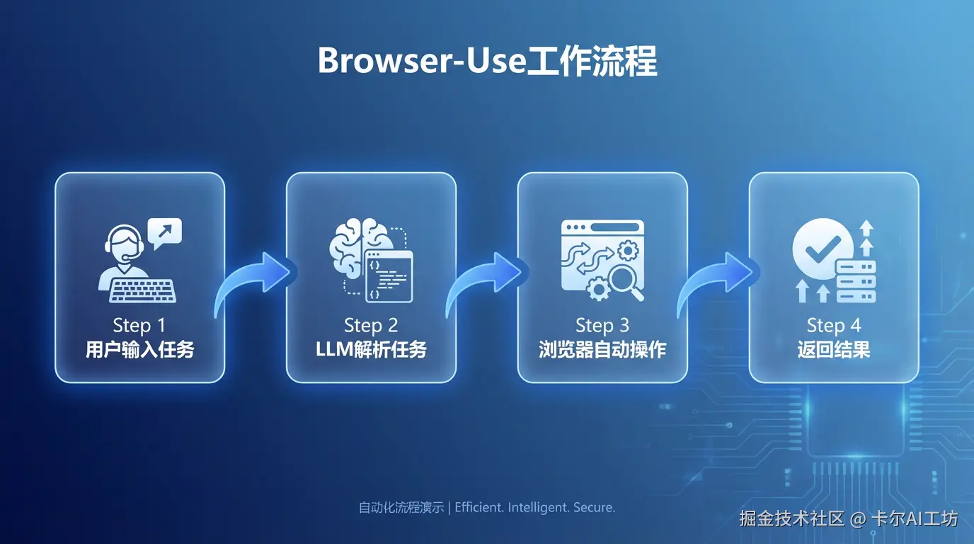 Browser-Use解决的问题很直接:让LLM直接操作浏览器,像人一样点击、输入、导航。