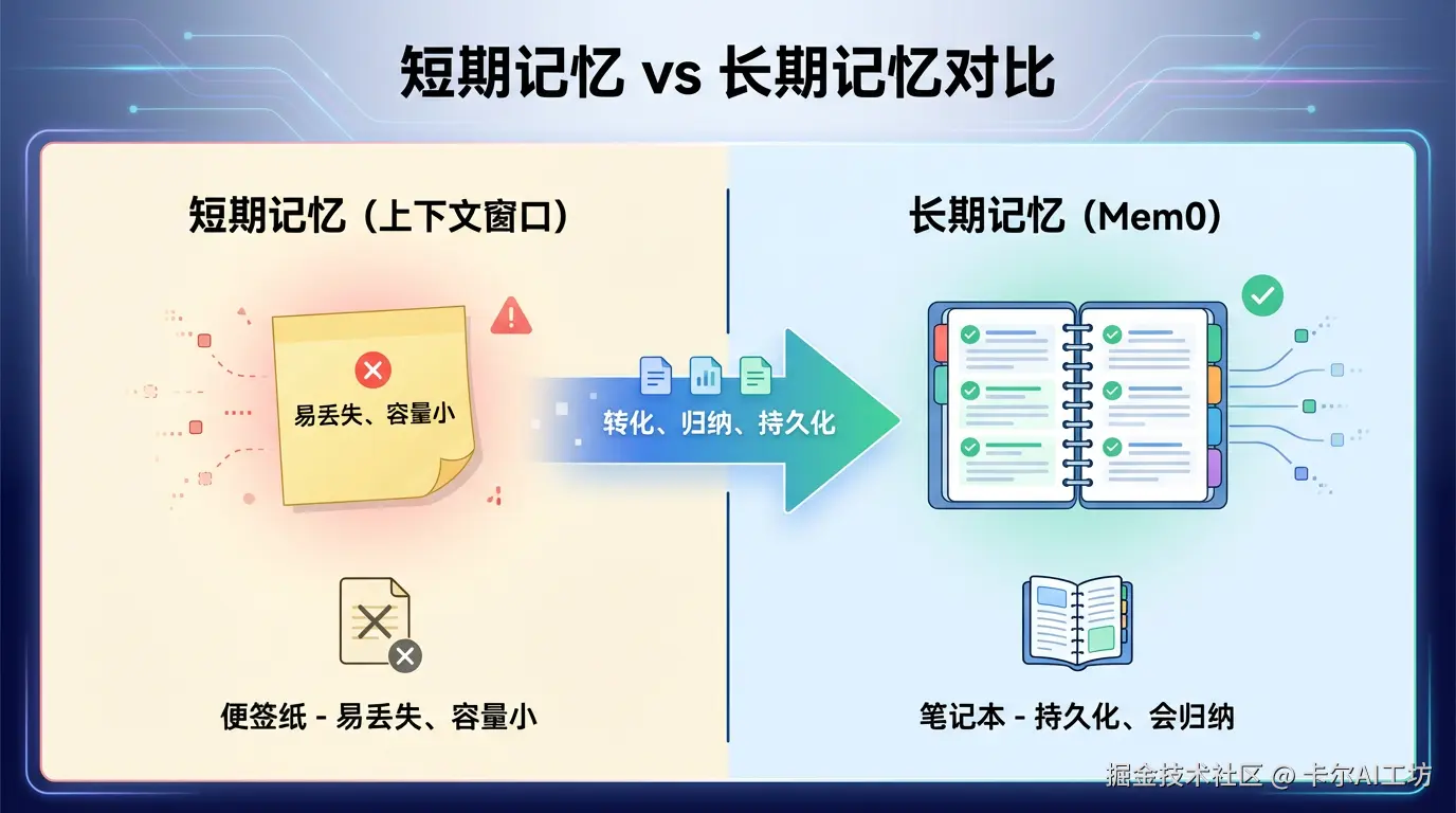 技术上,它不是简单地把对话存数据库。它会自动提取"值得记住的信息",做去重、更新、关联。你可以理解为:如果上下文窗口是便签纸,Mem0就是一个会自动整理的笔记本。