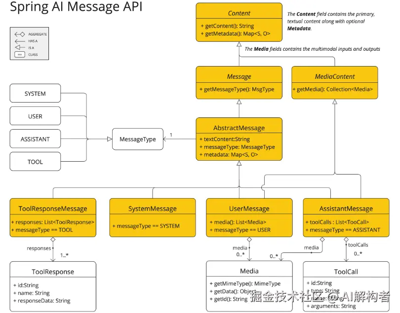 多模态消息类型还实现了<font style="color:rgb(25, 30, 30);">媒体内容</font>接口提供列表<font style="color:rgb(25, 30, 30);">媒体</font>内容对象。