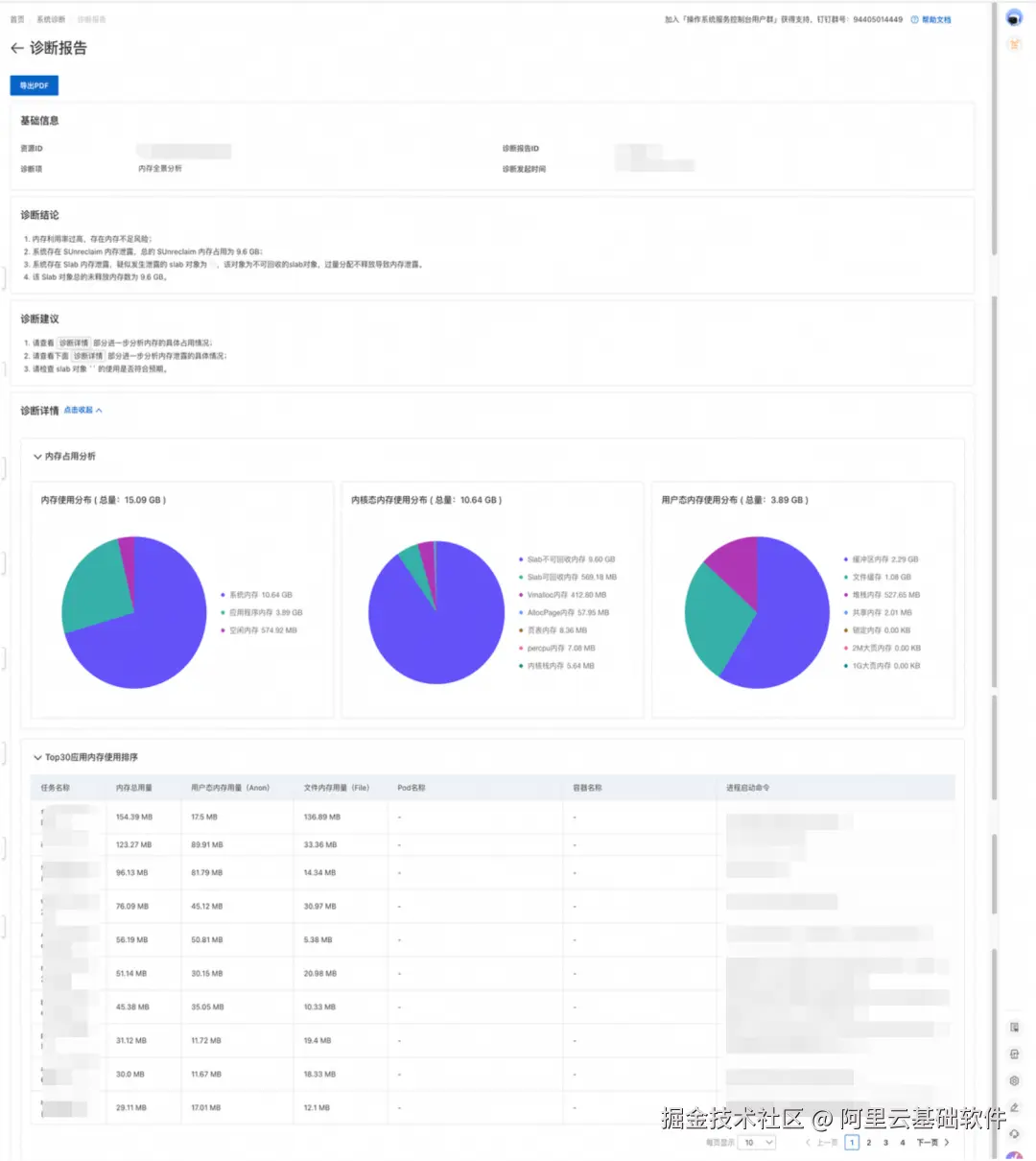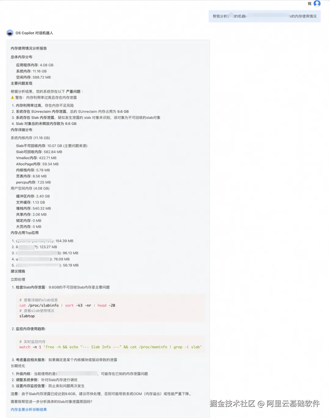 我们可以看到上图的对话中,OS Copilot 给出了可能的泄漏原因。同时也可以点击下方的诊断报告,在操作系统控制台查看更详细的诊断结果。