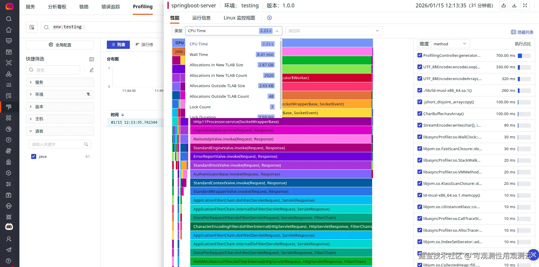 登录观测云平台,访问「应用性能检测」-「Profling」可以查看到刚刚上报的 Profling 信息
