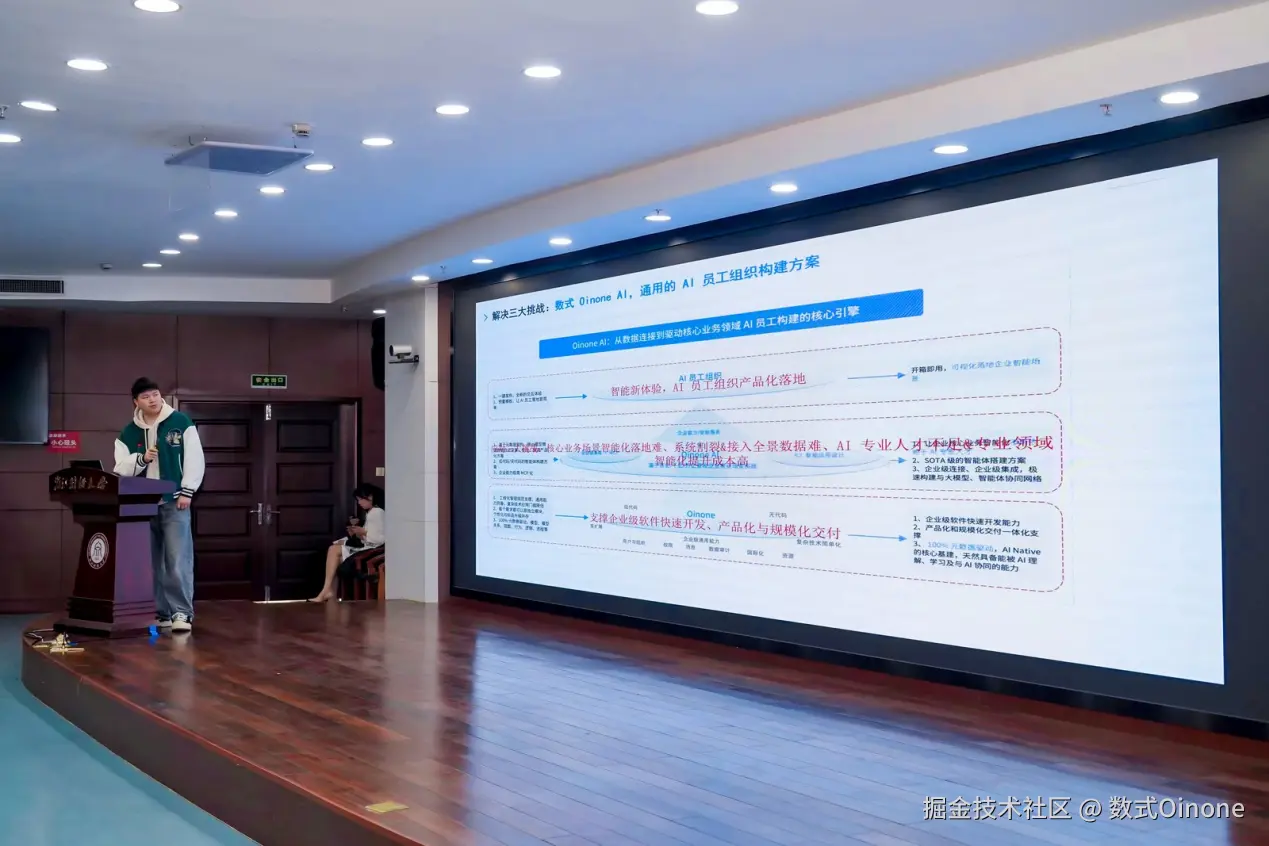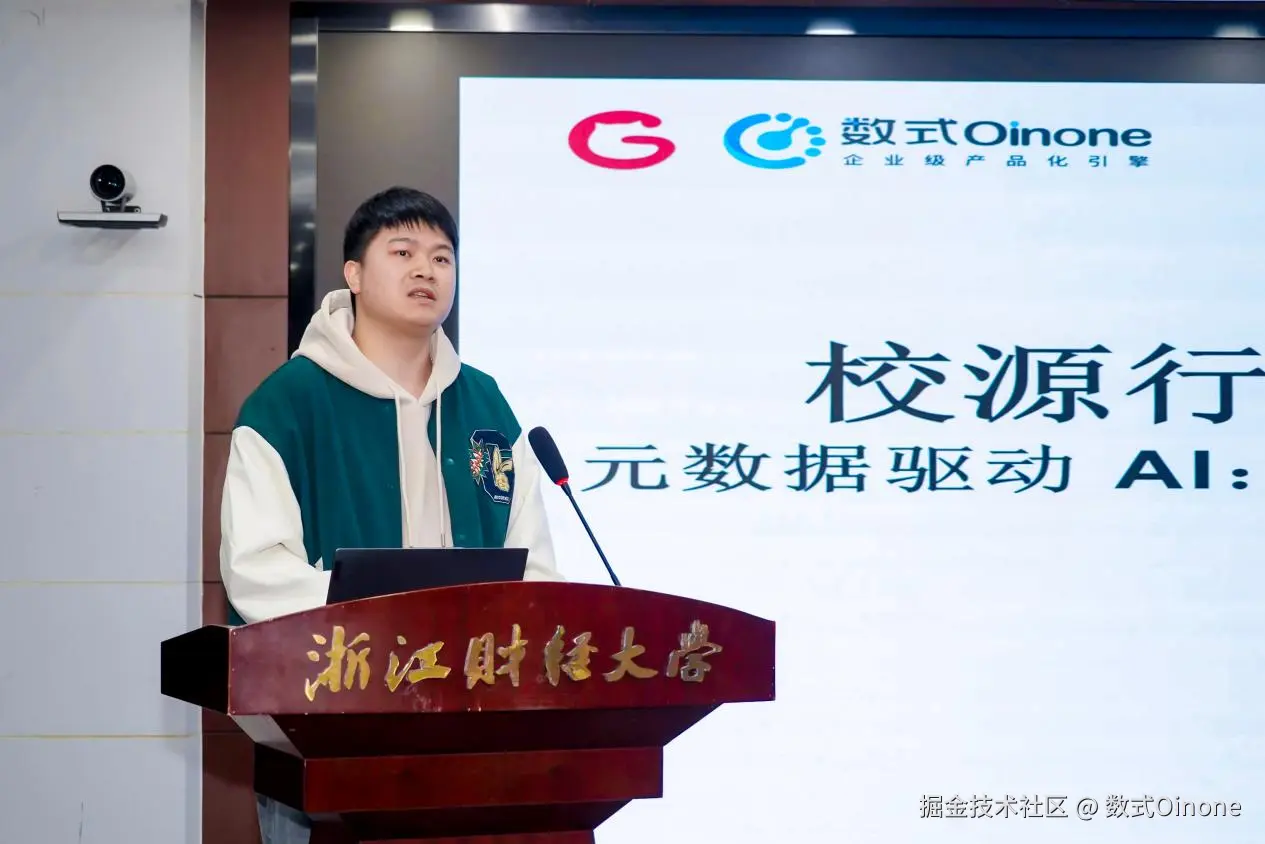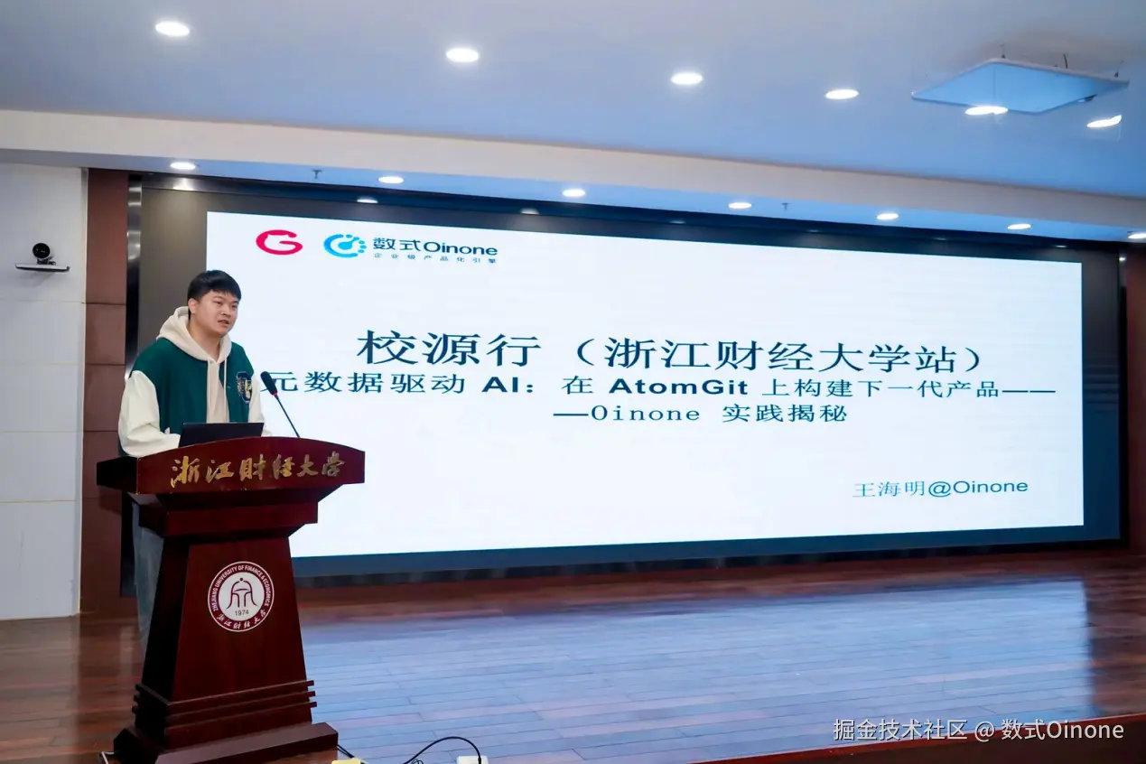 12月9日,数式Oinone受邀参加开放原子校源行——浙江财经大学站活动,技术总监王海明带来元数据驱动AI:在AtomGit上构建下一代产品——Oinone实践揭秘的主题分享,与现场高校师生、企业代表及开源社区伙伴深入交流,拆解AI与企业级产品化引擎的融合实战思路,帮师生以及在场的企业代表加深对开源协作和产品化的理解。