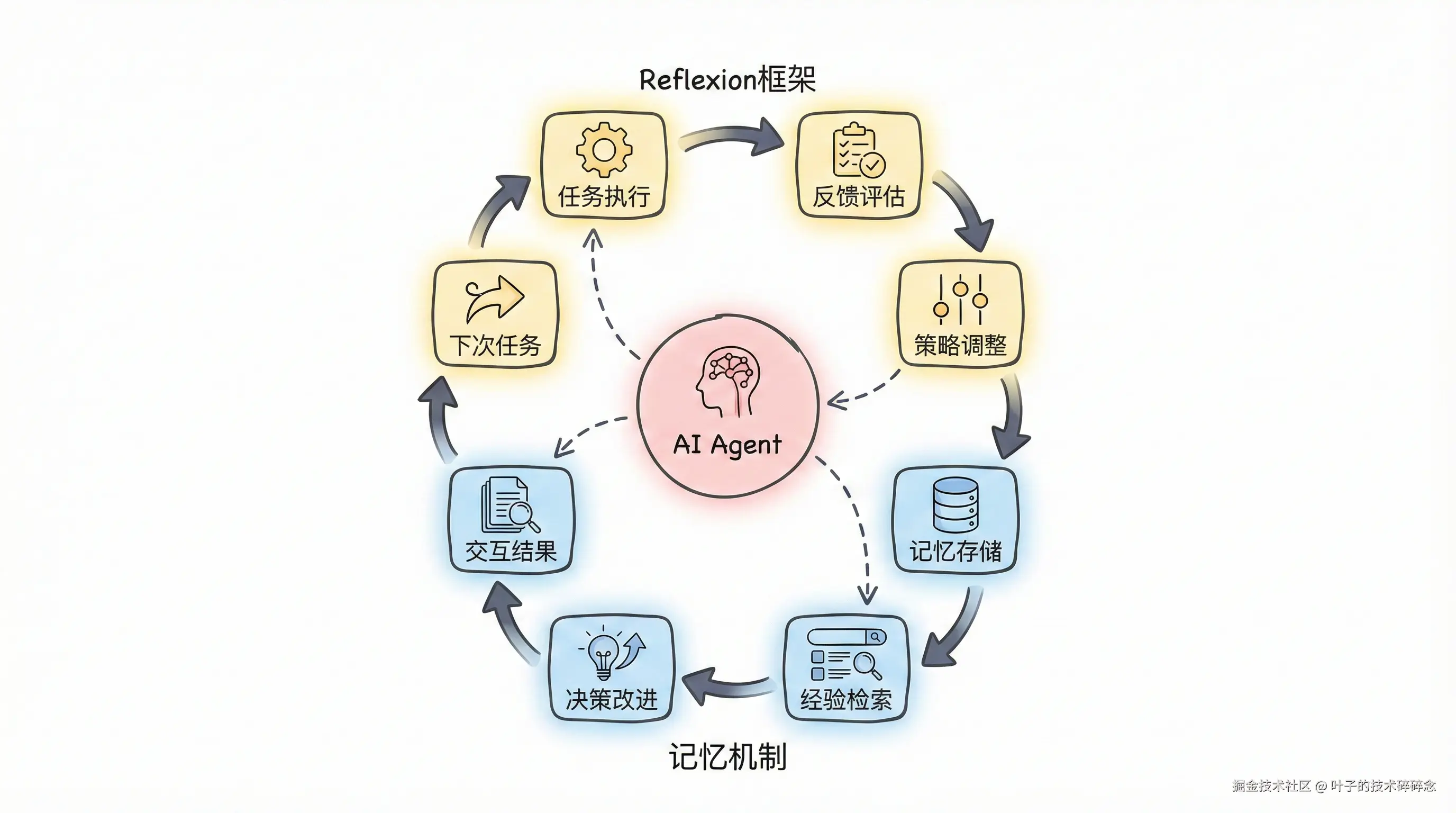 反馈:AI完成任务后会评估自己的推理过程。比如Reflexion框架让AI检查自己的行动序列是否有效。发现问题后,它会在下次任务中避免同样的错误。