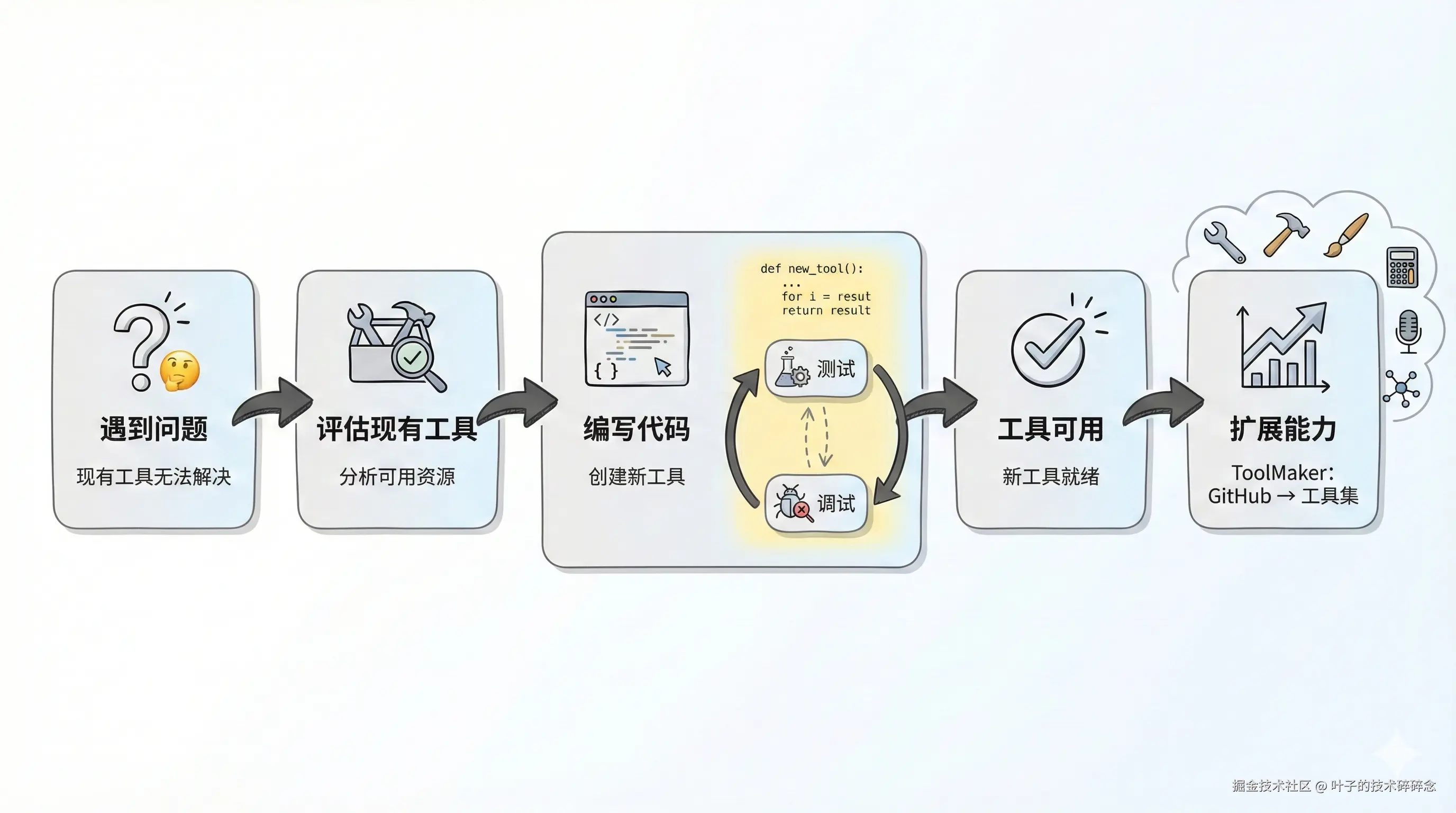 当遇到现有工具无法解决的问题时,AI会写代码、测试、调试,直到创建出能用的工具。比如ToolMaker框架甚至可以把整个GitHub仓库转换成AI可调用的工具集。