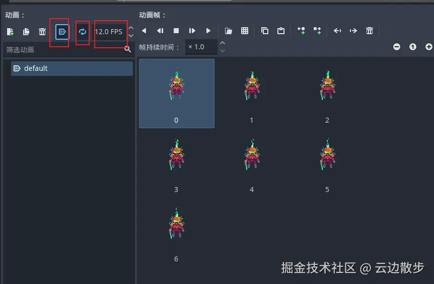 - 接下来我们的默认动画是每秒5帧,我们需要修改为每秒12帧,以及进行循环播放,还有设置打开游戏开始时进行自动播放
