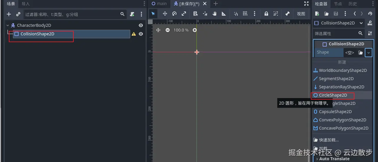 - 然后为了为了让CharacterBody2d节点与物理世界互动,我们需要创建一个碰撞体形状,也就是这个玩家节点创建好之后的黄色警告的由来