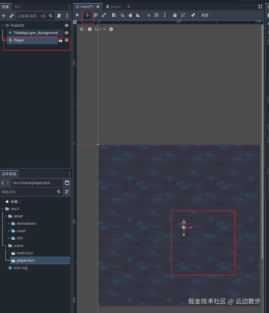 - 然后我们打开移动模式,移动玩家的角色在地图中间,这里需要注意的是,记得拖拽上去的玩家节点要在瓦片地图层下面