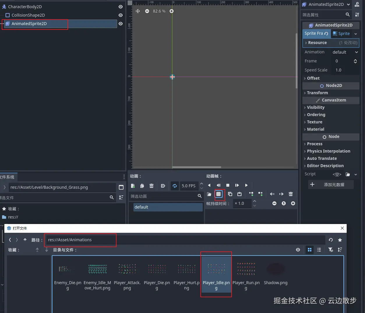 CharacterBody2D+圆形碰撞体搭建可脚本控制的物理角色。 - 动画配置:通过