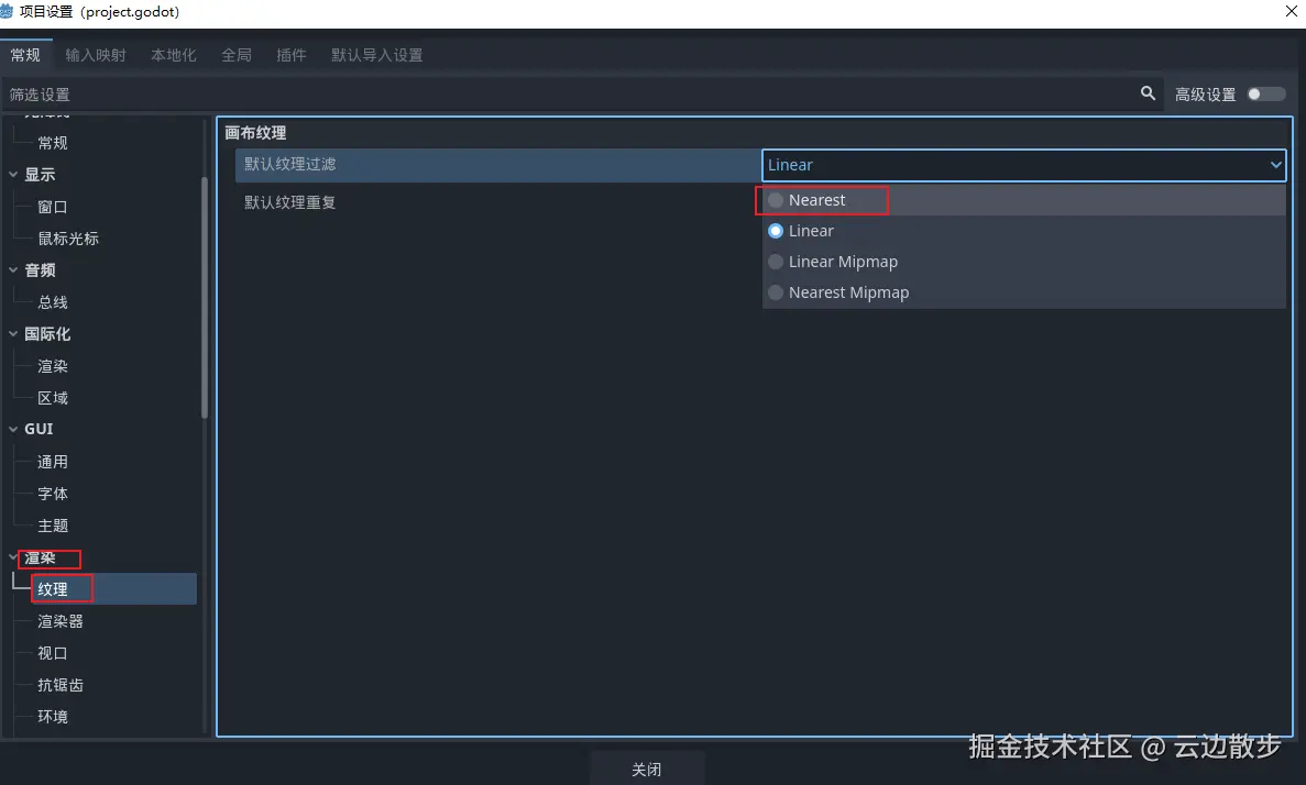- 然后我们会发现我们导入的玩家角色有点模糊,我们来到左上角点击项目点击项目设置这里,弹出窗口之后我们来到渲染选择纹理,在纹理的默认纹理过滤属性那里选择Nearest