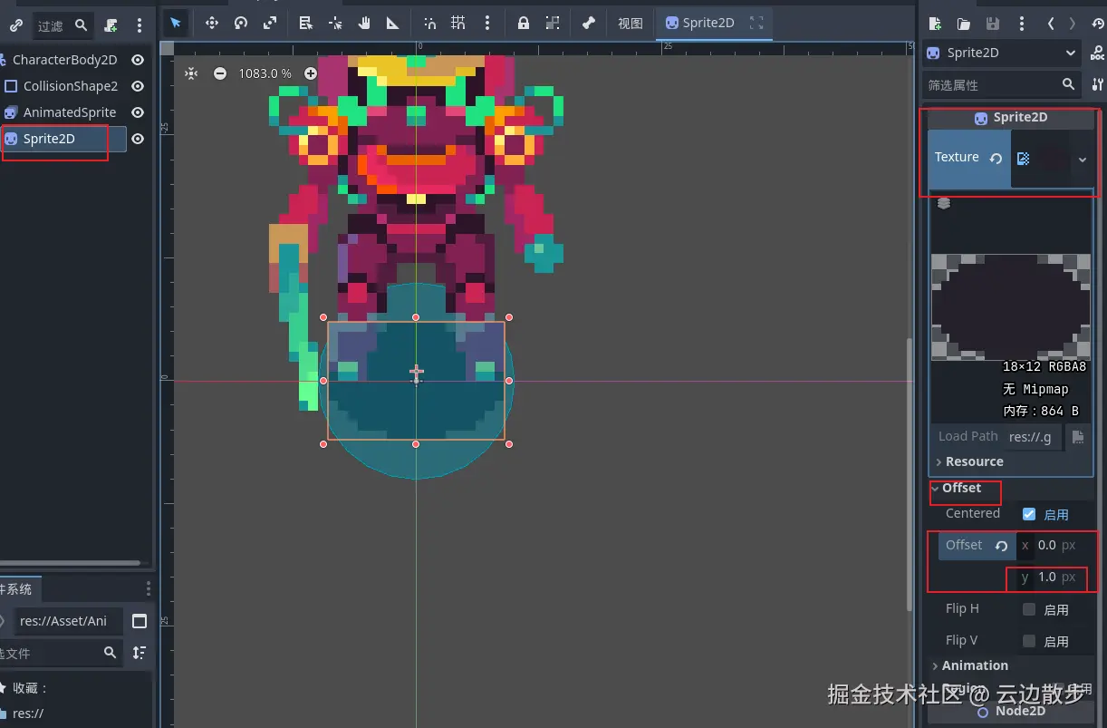 - 然后因为这里发生了偏移(不在中心位置了),我们需要在纹理那里进行校正一下,在2d精灵节点的检查器的纹理那里进行修改一下y轴的位置改为1
