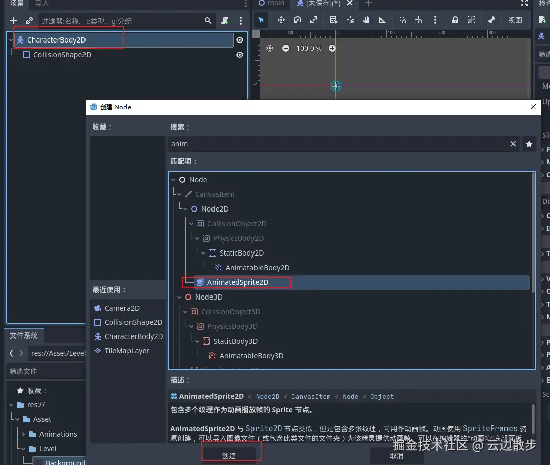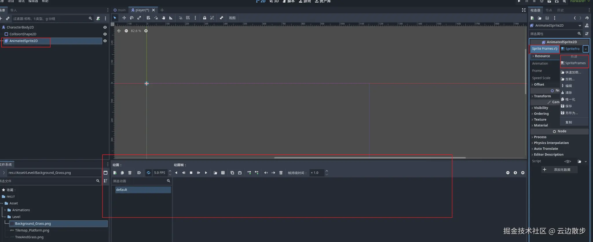 - 接下来让我们进行创建玩家角色动画,我们的角色在执行不同动作时会播放不同的动画AnimatedSprite2d节点可以帮助我们播放动画,所以我们这里需要在玩家场景下创建一个新的节点