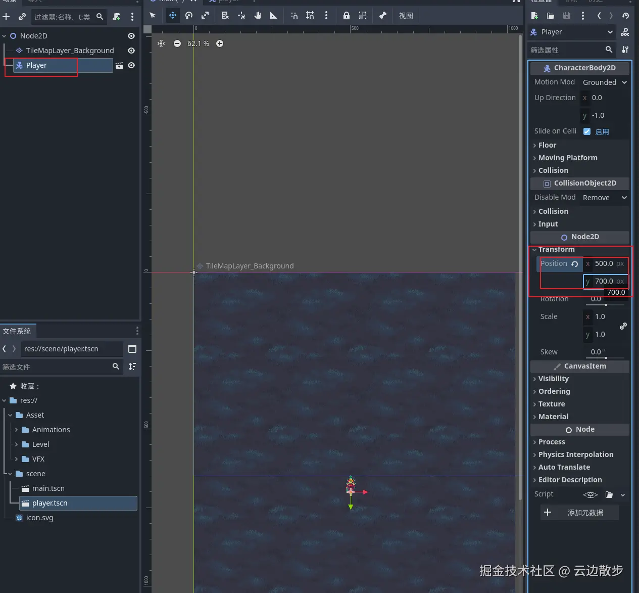 - 或者直接打开transform进行修改玩家角色的位置,这里修改的是500px,700px