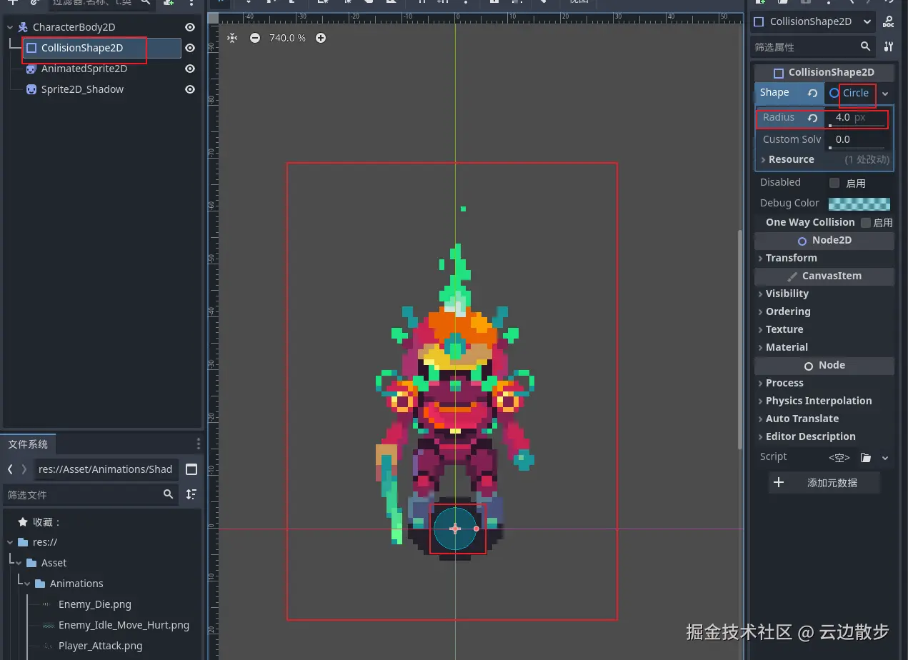 - 然后我们来修改一下之前设置好的圆形碰撞体形态的大小,修改它的半价为4px,我们的玩家角色将仅基于这个圆形区域与游戏世界中的墙壁发生碰撞