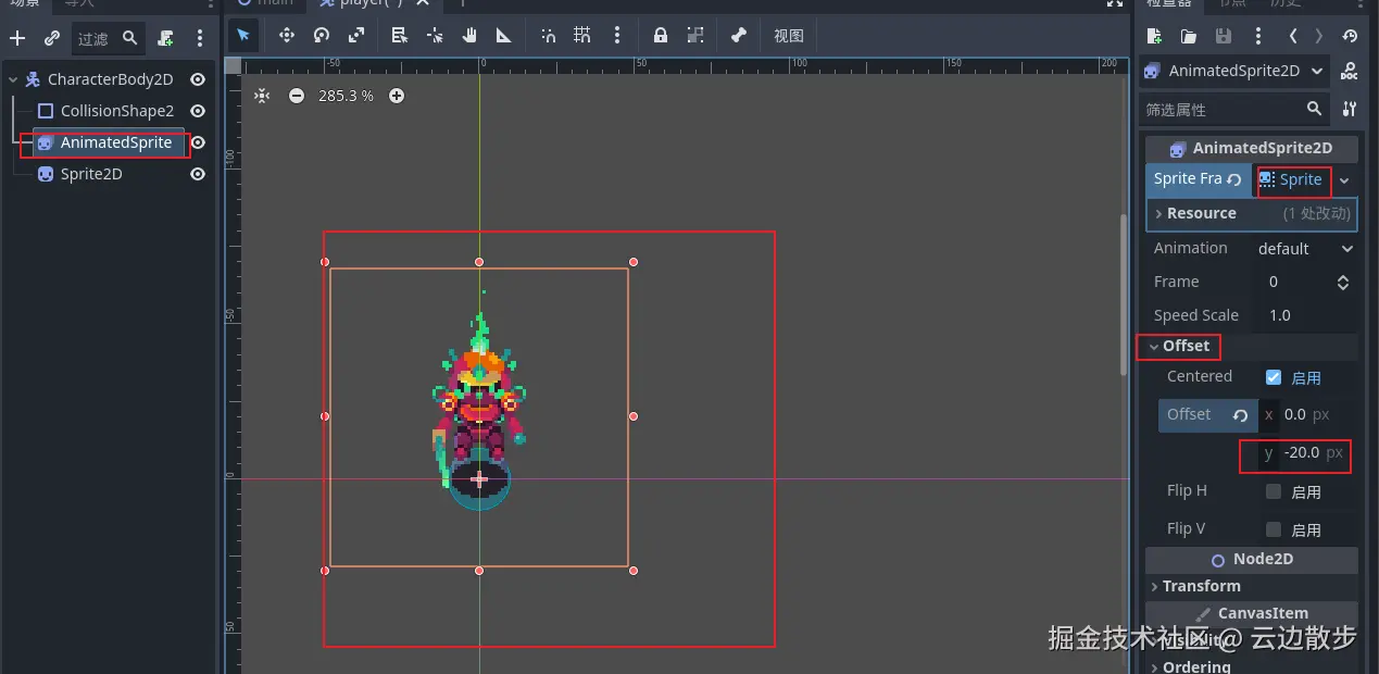- 然后我们需要在让我们在不改变AnimatedSpy2D节点位置的情况下将角色上移,所以我们就来到2d动画精灵节点的精灵帧那里进行修改位置,我们点击精灵帧(不要点到旁边的下拉了),然后点击那个offset,然后进行修改y轴位置,改为-20这样子就是向上进行偏移了