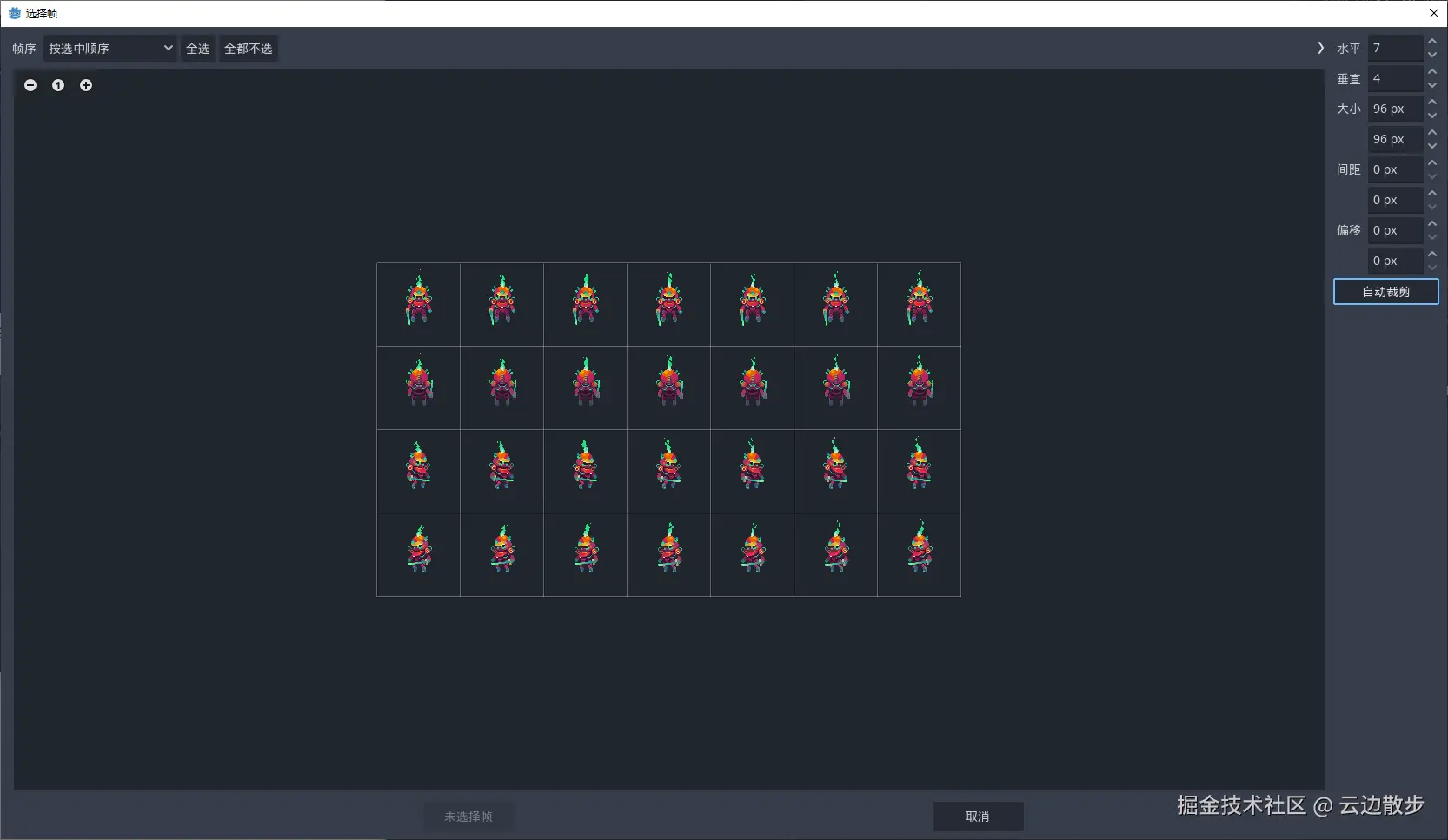 - 我们可以看到玩家的待机动画有四行,分别是上下左右的动画,我们点击右边的自动分割,然后就会变成合适4行7列