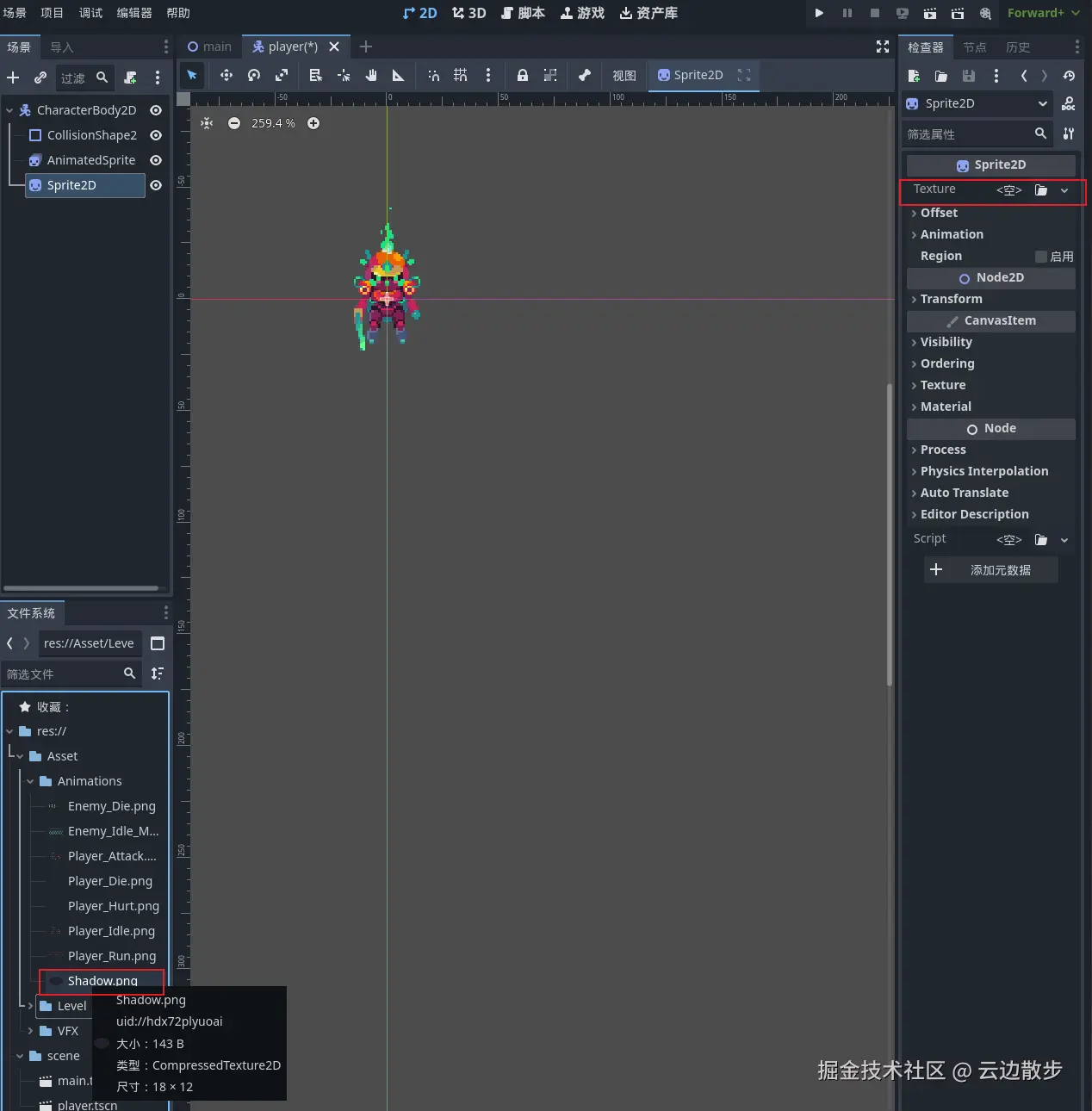 - 新建好这个2d精灵节点之后,我们需要打开animation文件夹中,将阴影文件拖动到这个2d精灵节点的检查器中的纹理属性中