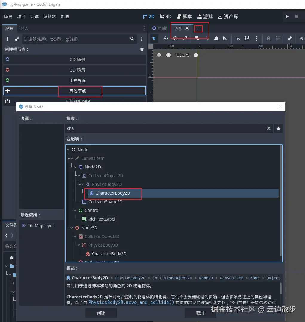 - 然后我们需要创建一个新的场景,点击加号创建一个新的场景,然后选择添加其他节点,然后这个节点就是 CharacterBody2D,这个是一个可以通过脚本代码进行控制行为的物理体,值得注意的是它虽然是一个物理体但是不会进行遵循物理规律进行自动移动